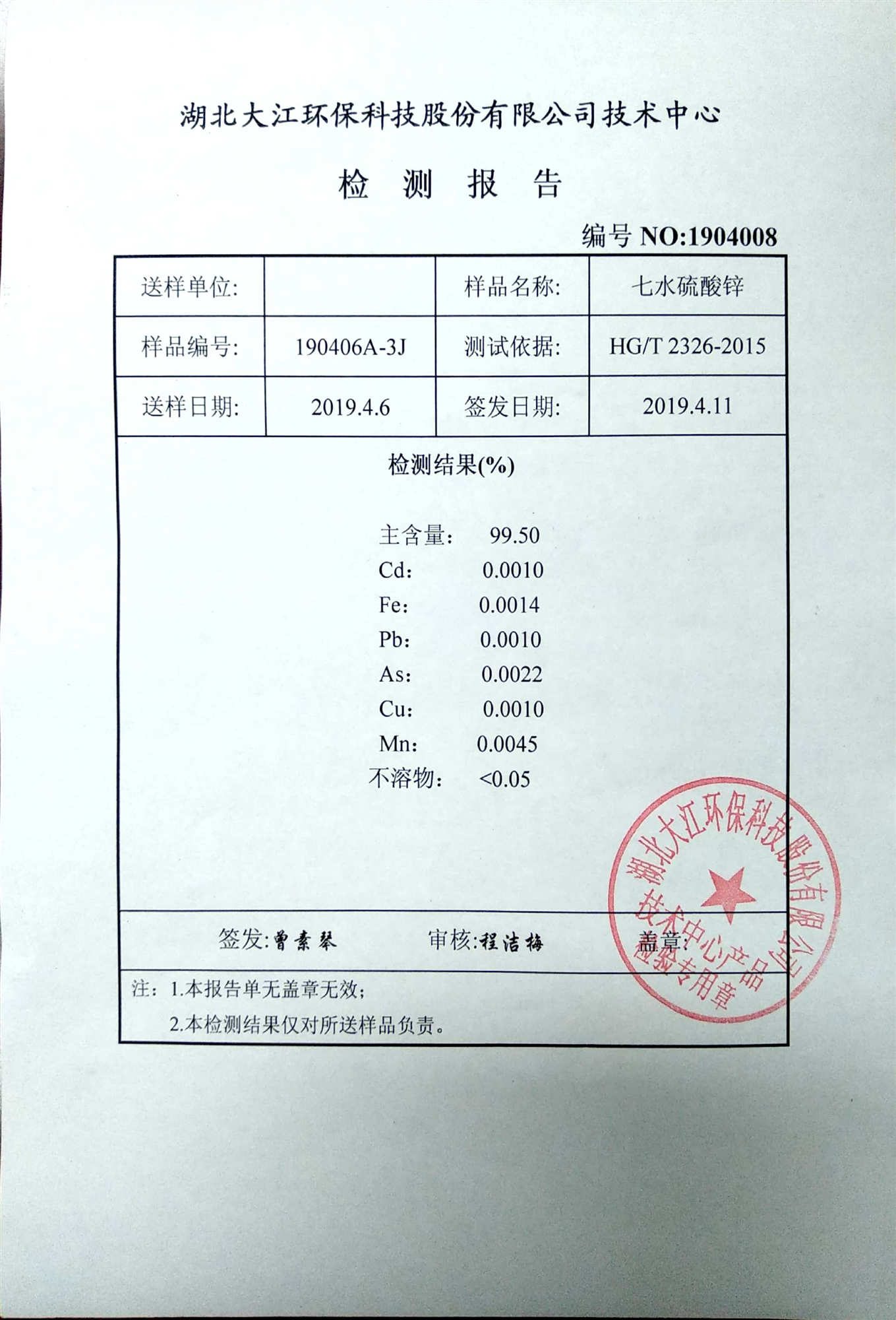 我公司生產(chǎn) “銅草花”牌七水硫酸鋅,產(chǎn)量:15000余噸/年;產(chǎn)品級(jí)別為:工業(yè)級(jí);執(zhí)行標(biāo)準(zhǔn)為:HG/T 2326-2005,工業(yè)硫酸鋅Ⅱ類一等品;ZnSO4·7H2O主含量≥99%(Zn含量≥22.6)。水不溶物≤0.02%、鉛(Pb)含量≤0.002% 、鎘(Cd)含量≤0.002%、砷(As)含量≤0.005%、鐵(Fe)含量 ≤0.005% ;包裝為50公斤/袋的內(nèi)塑外聚丙烯編織袋。我公司年產(chǎn)23000噸。